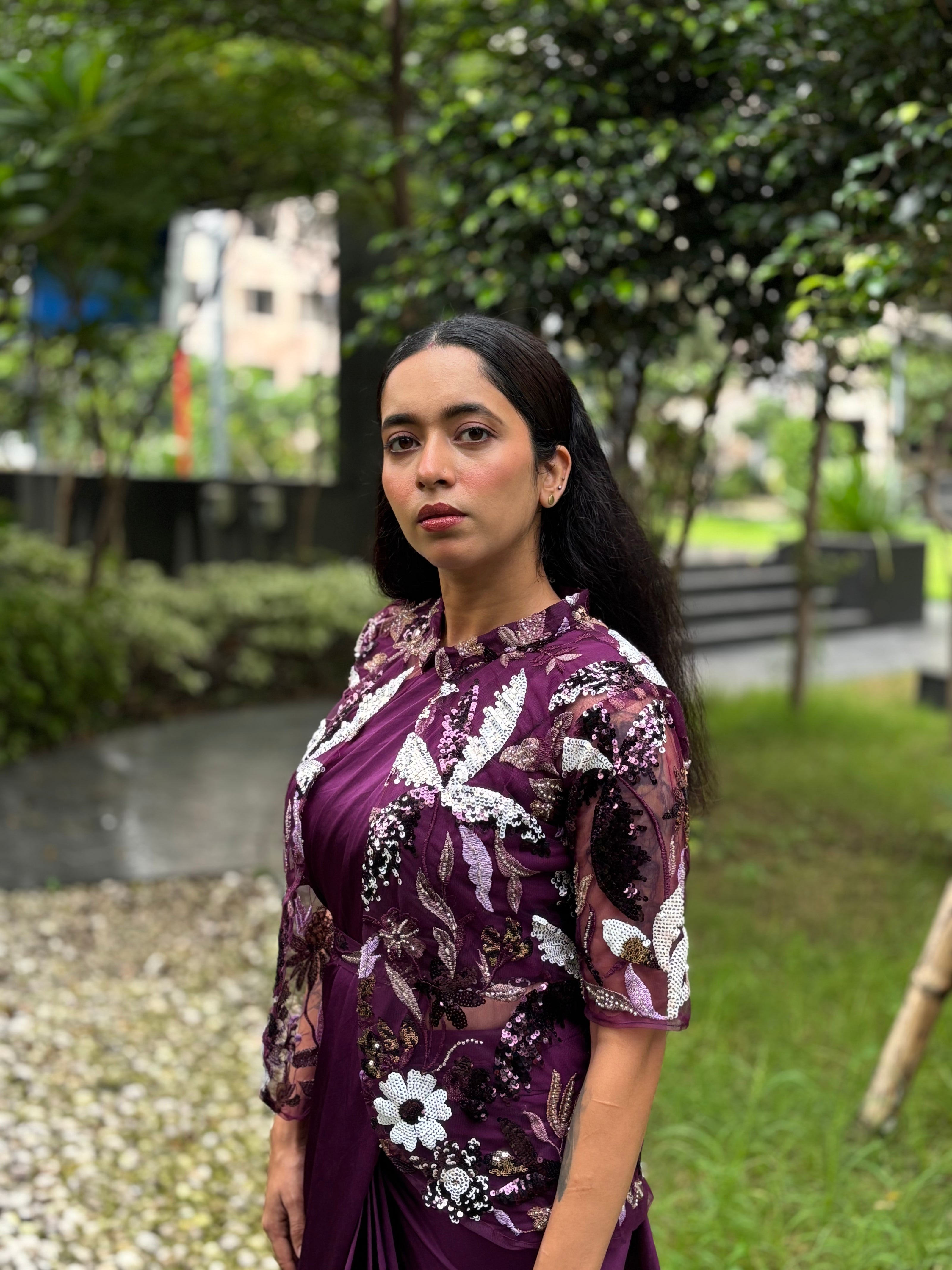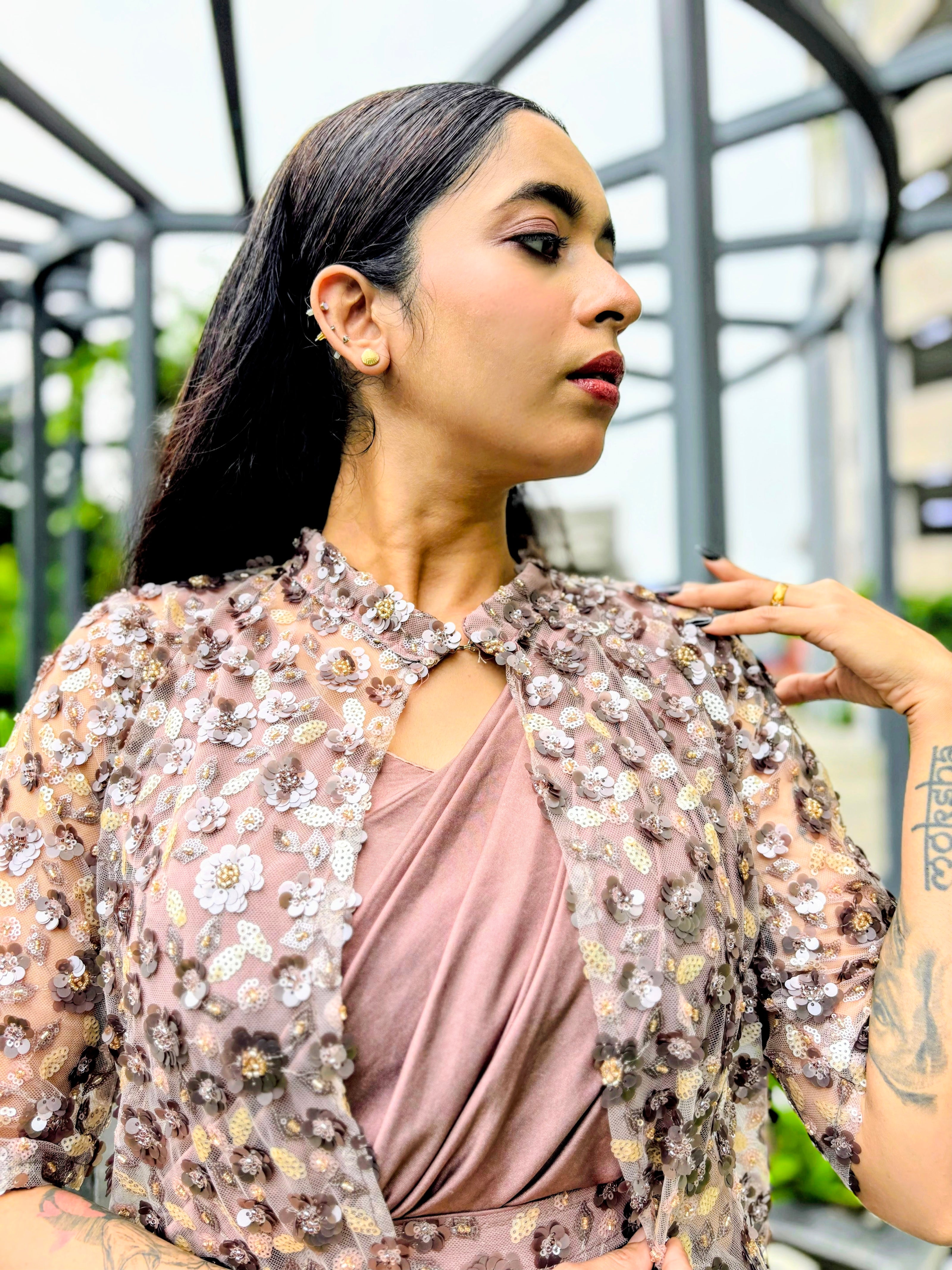 Ready to wear saree silk sleeveless blouse with sequin embellished jacket and belt
