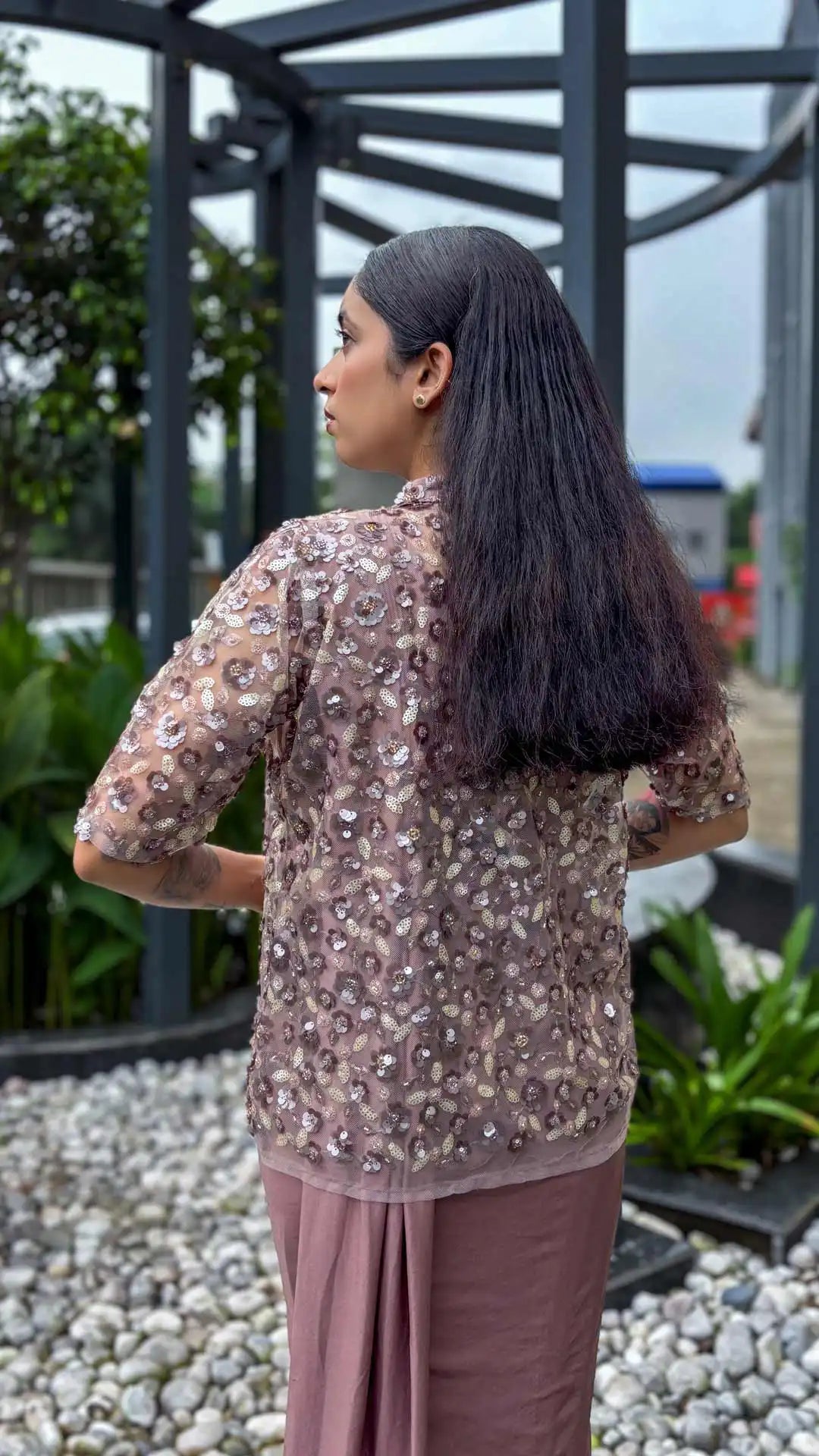 Ready to wear saree silk sleeveless blouse with sequin embellished jacket and belt